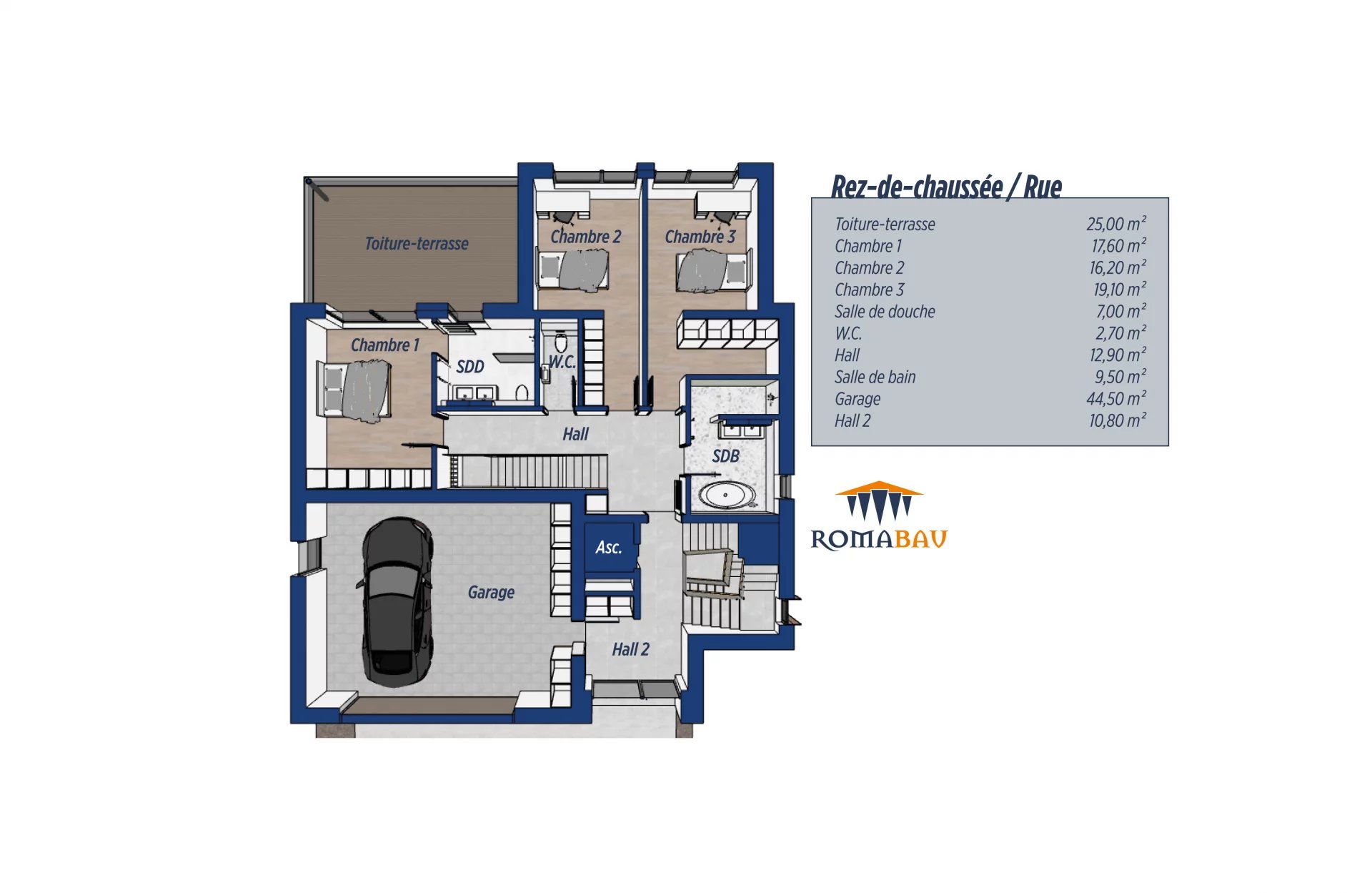 Au rez-de-chaussée, vous découvrirez un hall d'entrée, un garage pouvant accueillir deux voitures, une salle de bain, trois chambres à coucher dont une avec salle de douche privative et accès à la terrasse, ainsi qu’un W.C. séparé.