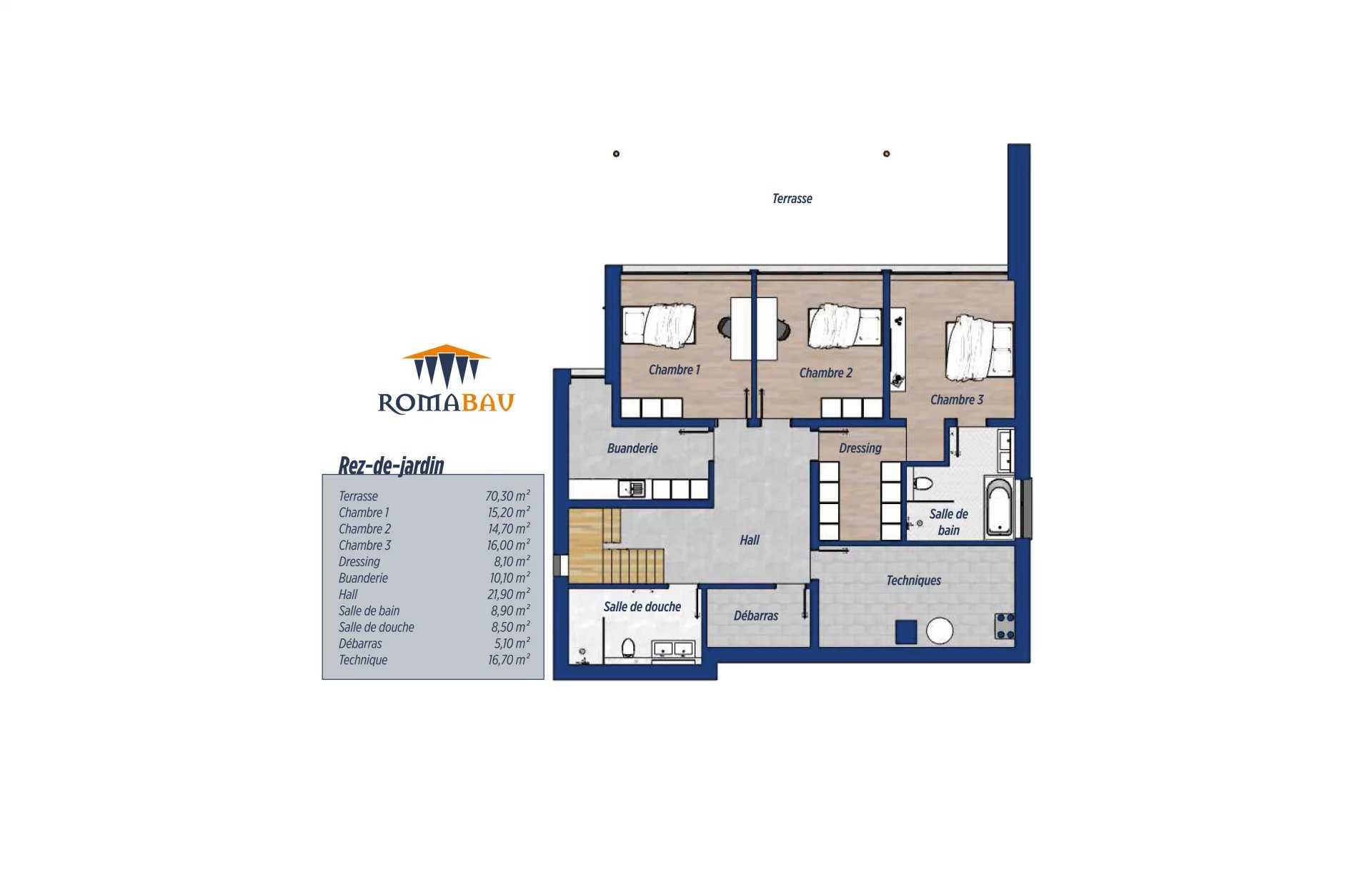 Le rez-de-jardin se compose d’un hall de nuit, d’un local technique, d’une buanderie, d’un débarras, de deux chambres à coucher, d’une salle de douche et d’une suite parentale avec dressing et salle de bain privative.