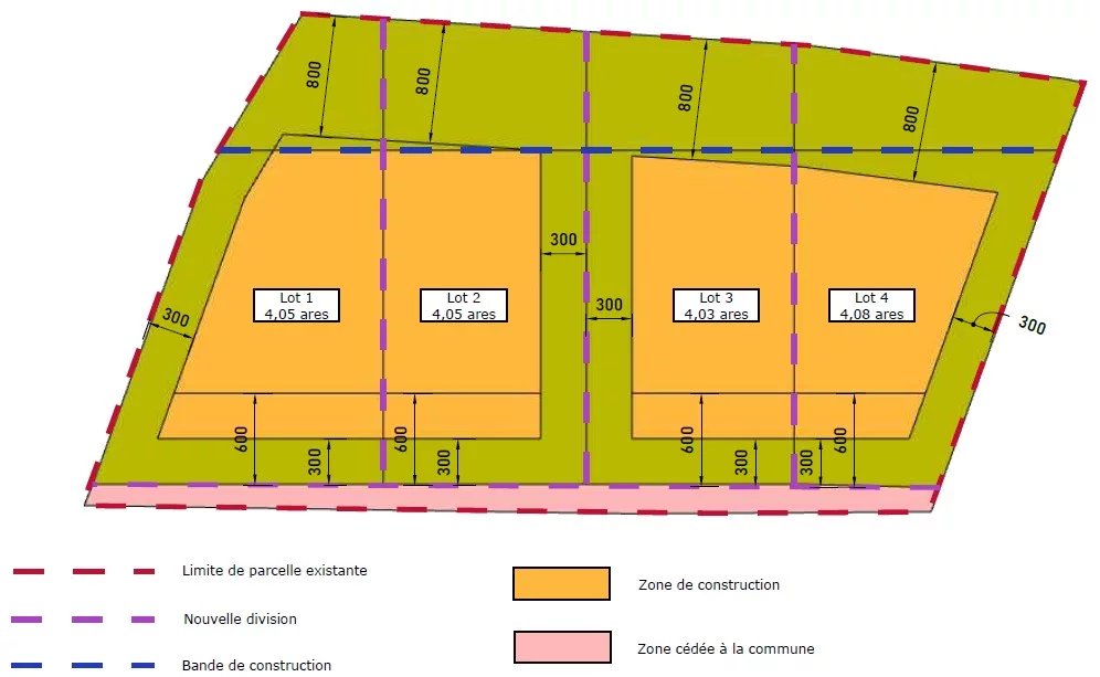 Sous réserve d’approbation, le terrain pourrait offrir la possibilité d’une division en quatre parcelles, permettant la réalisation de deux ensembles de maisons jumelées.