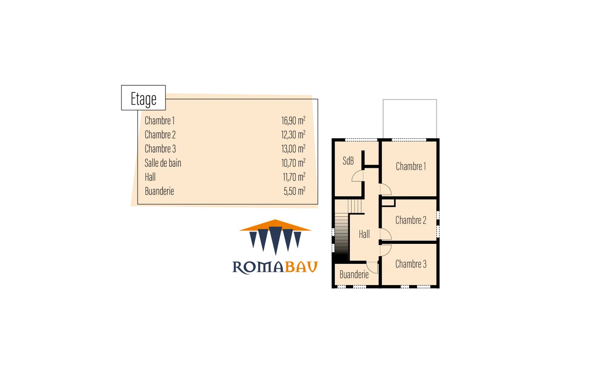 Le premier étage se compose d'un hall, de trois chambres, d'une salle de bains et d’une buanderie.