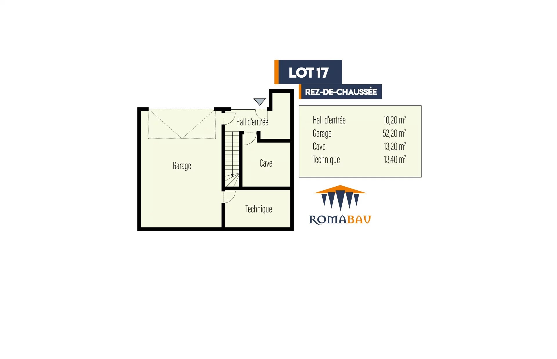 Im Erdgeschoss befinden sich ein Eingangsbereich, eine Garage mit Platz für zwei Autos, ein Technik- sowie ein Kellerraum.